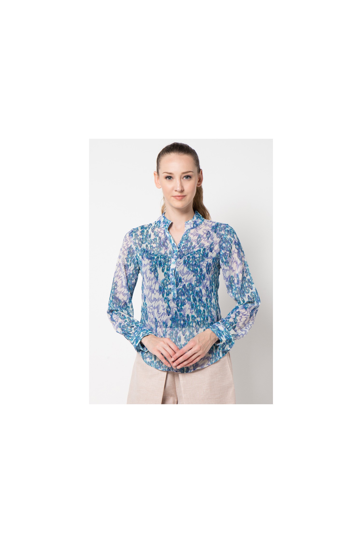 Sheer blouse with subtle floral print in blue color perfect to wear any day of the week. Match with your favorite black tank top and jeans or black pants.