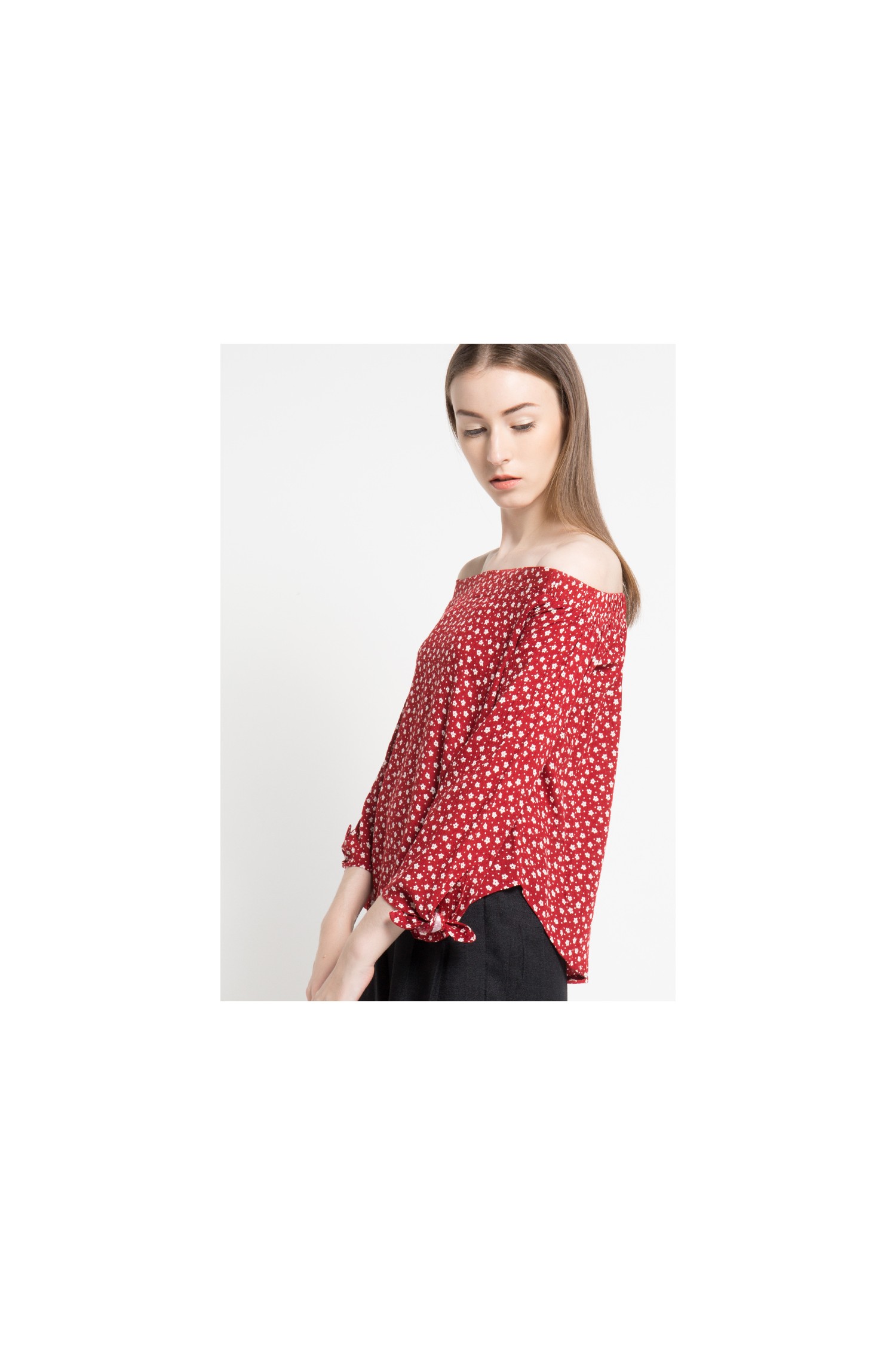 Off shoulder blouse in red floral print ,elasticated at back, three quarter sleeves with ties for a varied look