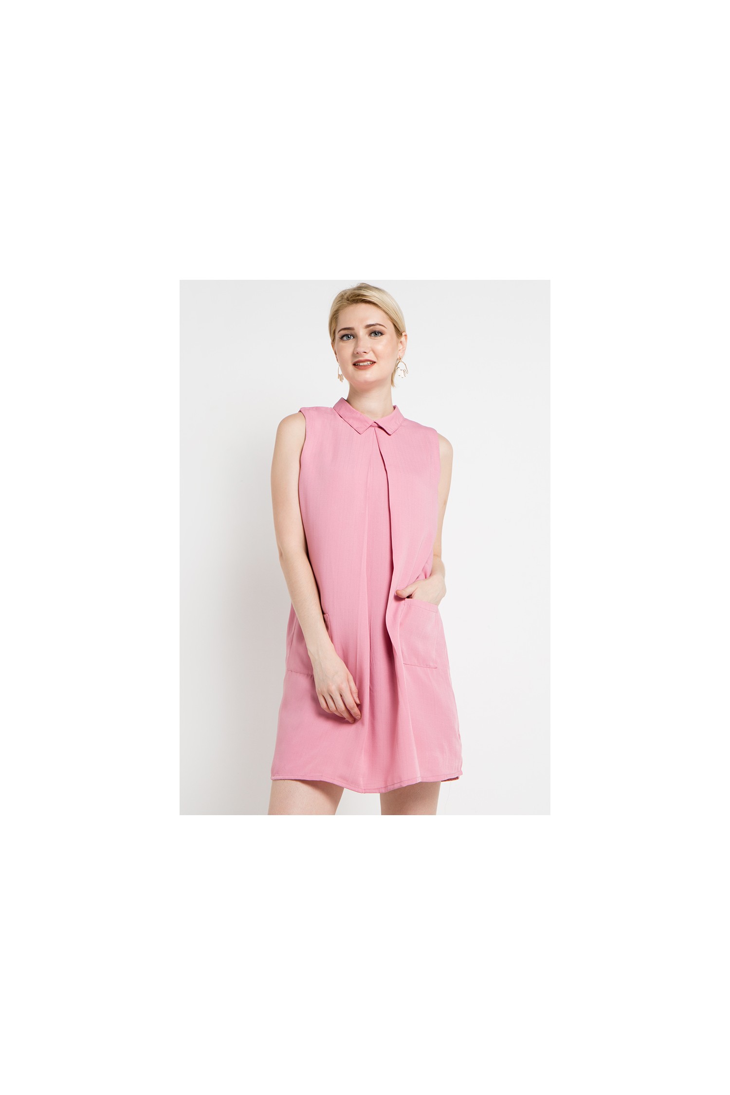 Sleeveless collared dress in pink with pocketed front and pleat accents, zipped at back for a great fit.