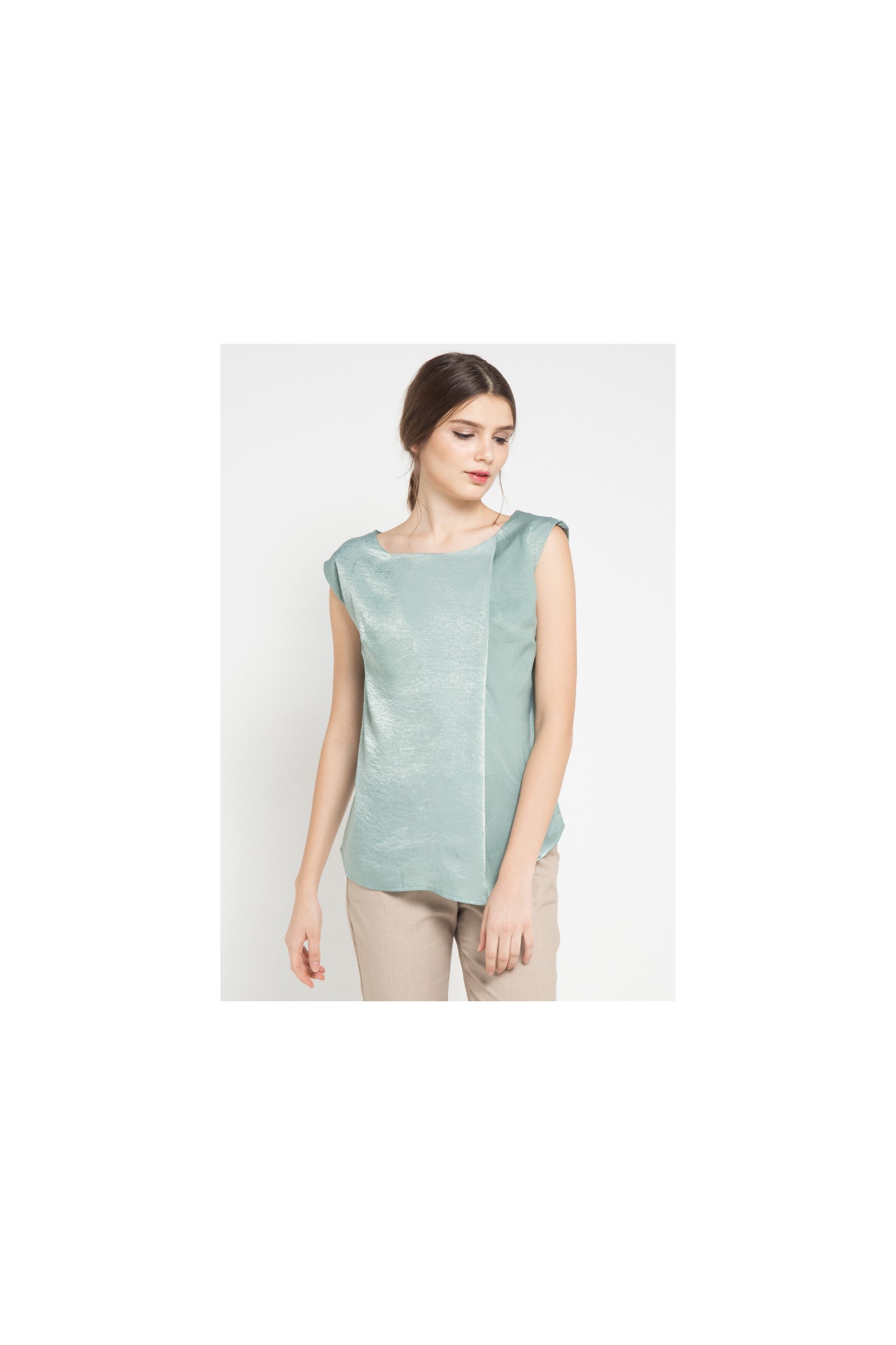 Capsleeved blouse with pleat accent at front for a varied look. Material features a satin look.