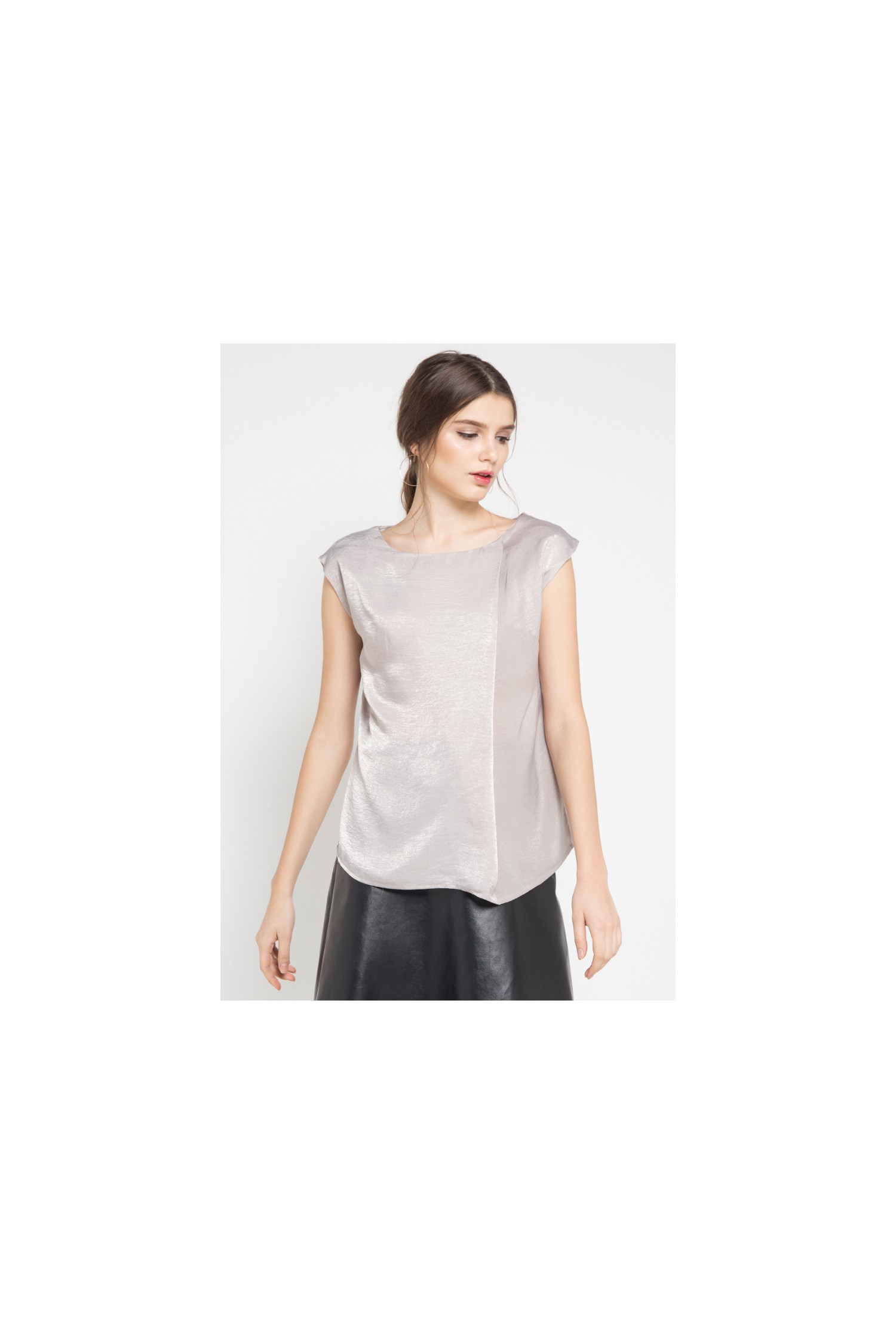 Capsleeved blouse with pleat accent at front for a varied look. Material features a satin look.
