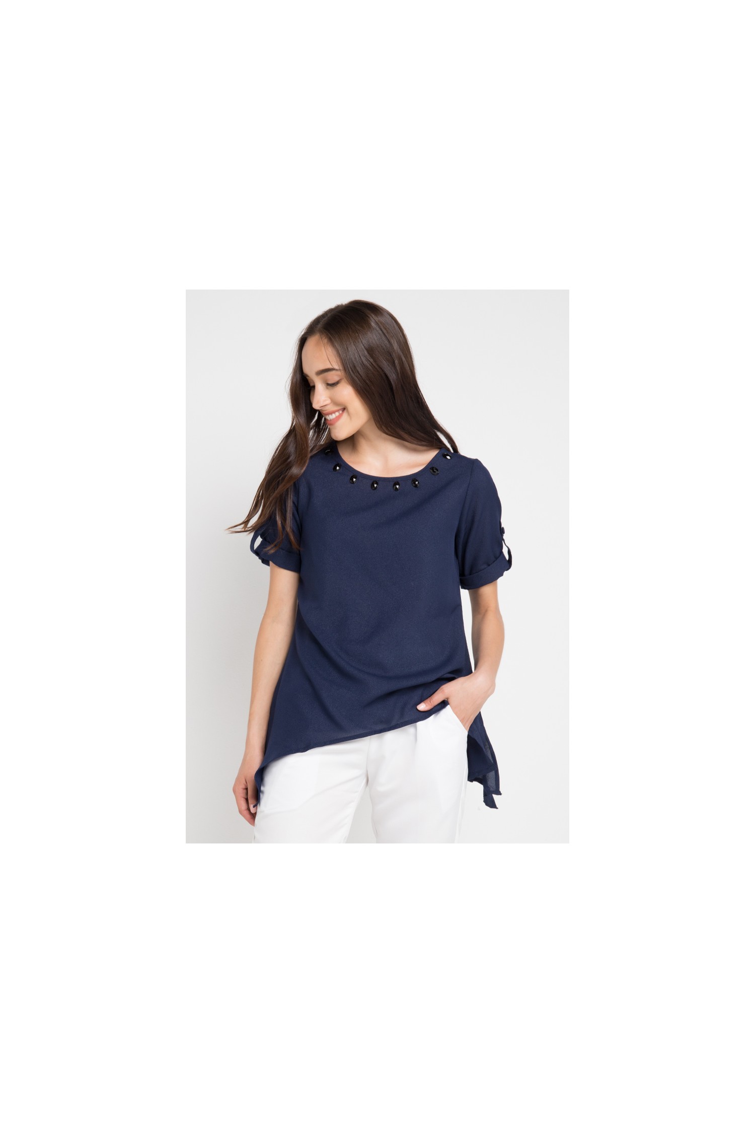 Assymetrical blouse with three quarter rollup sleeves and bead accents for a varied look