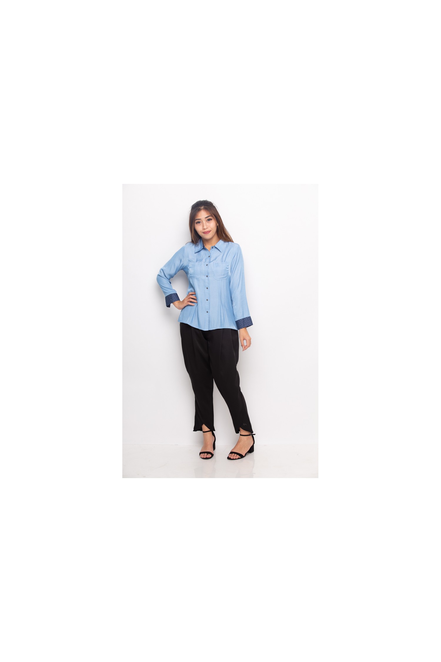 Enya Shirt is Blue, the material used by Chambray. Suitable for travel, office activities, semi-formal events.