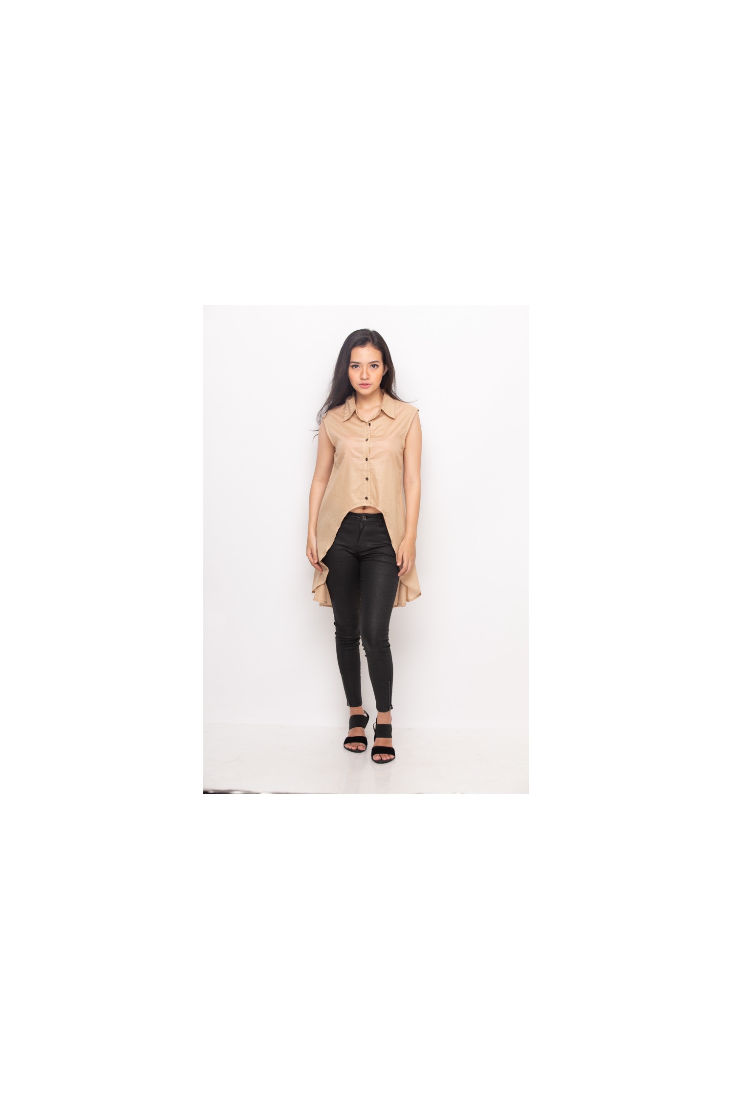 Litzi Assymetrical Shirt Beige, the material used by Cotton Lawn. Suitable for parties, travel, and non-formal events.