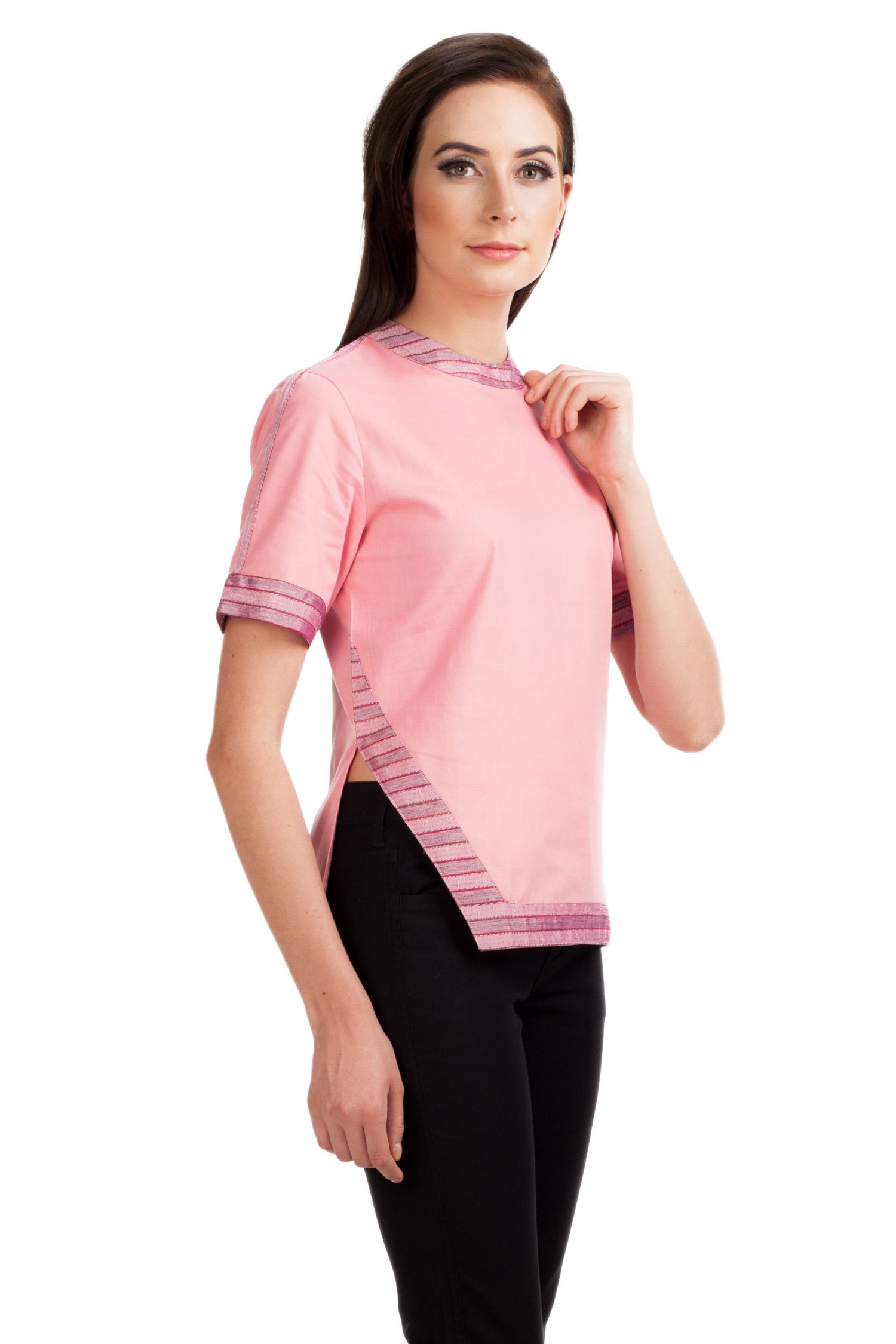 Atasan warna pink ini ada fitur cut di samping dan patterned border yang sangat menarik untuk siapa saja.