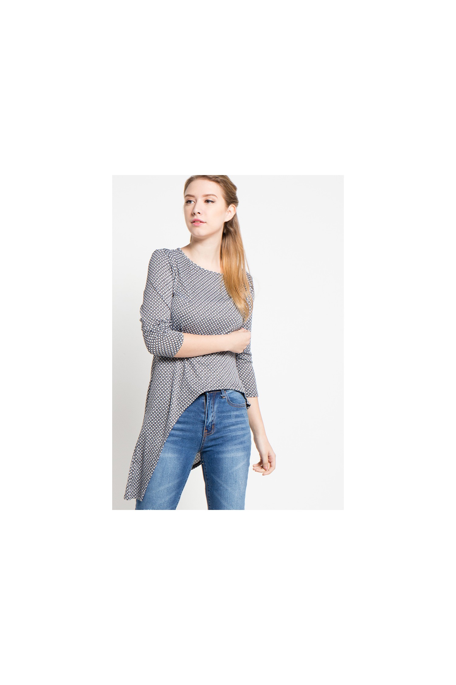 Asymmetrical knit top in white-black print with three quarter sleeves