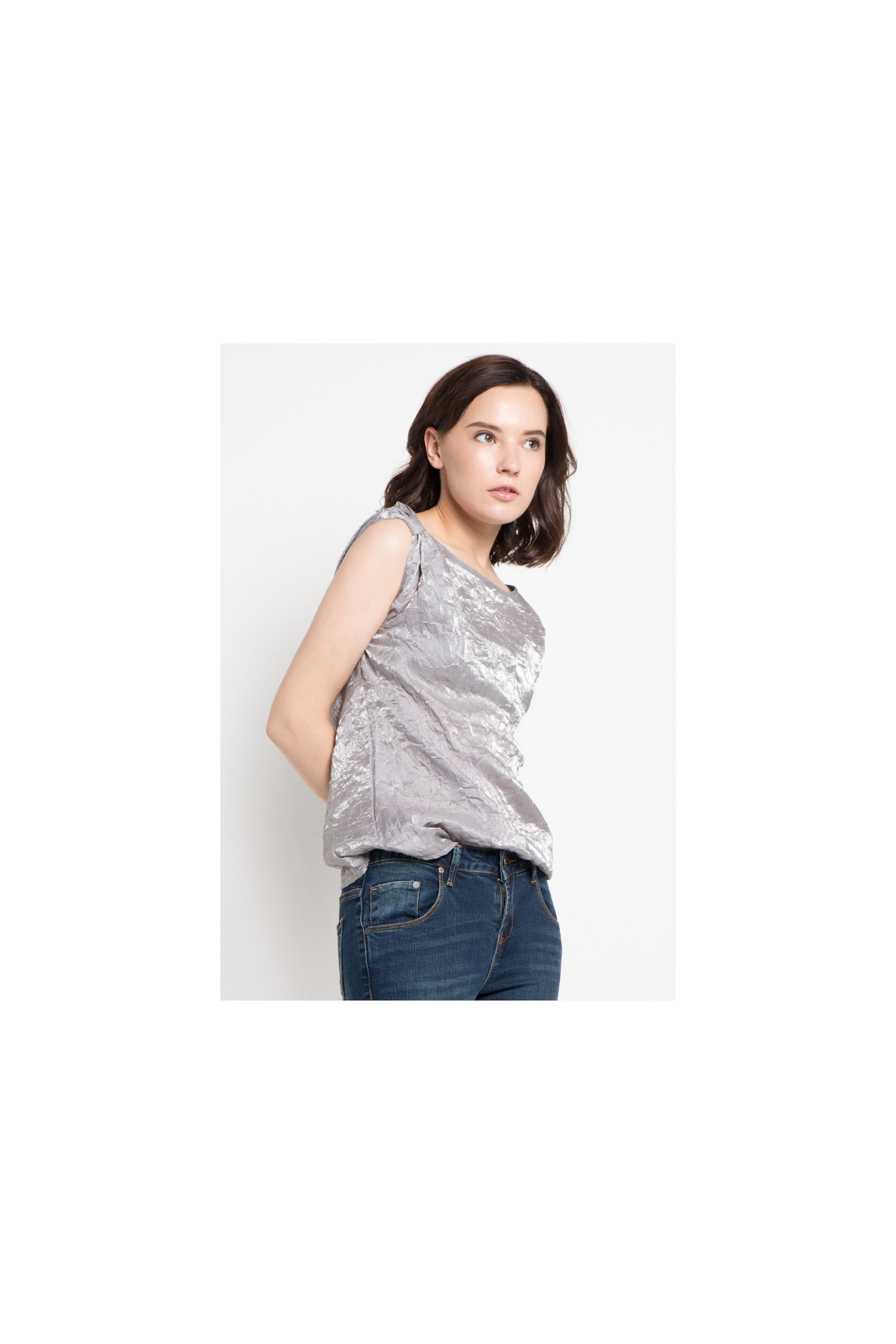 Sleeveless blouse in silver with asymmetrical cap sleeves for a varied look.