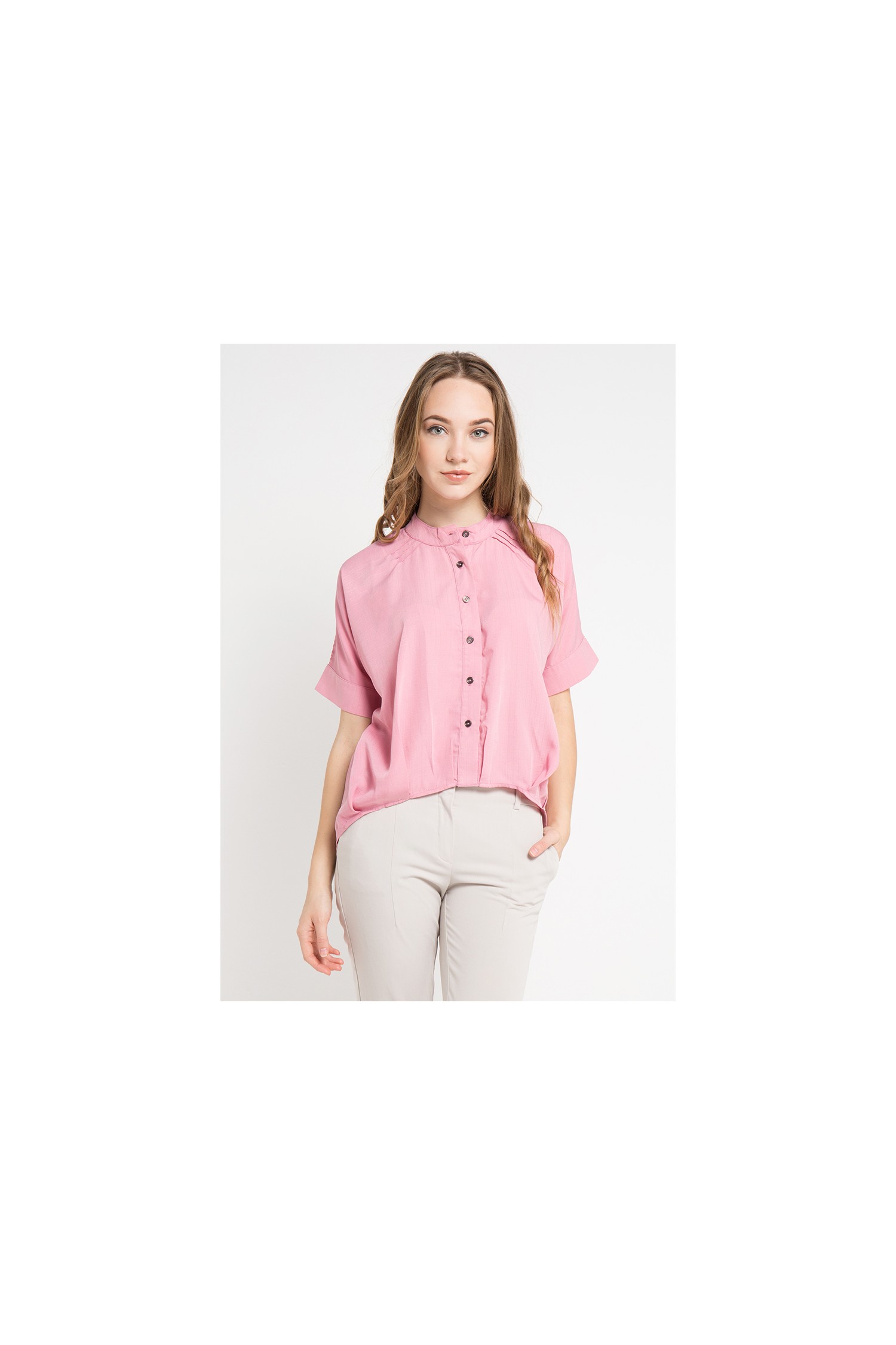 Pastel pink blouse with curved hem and buttons down front of blouse