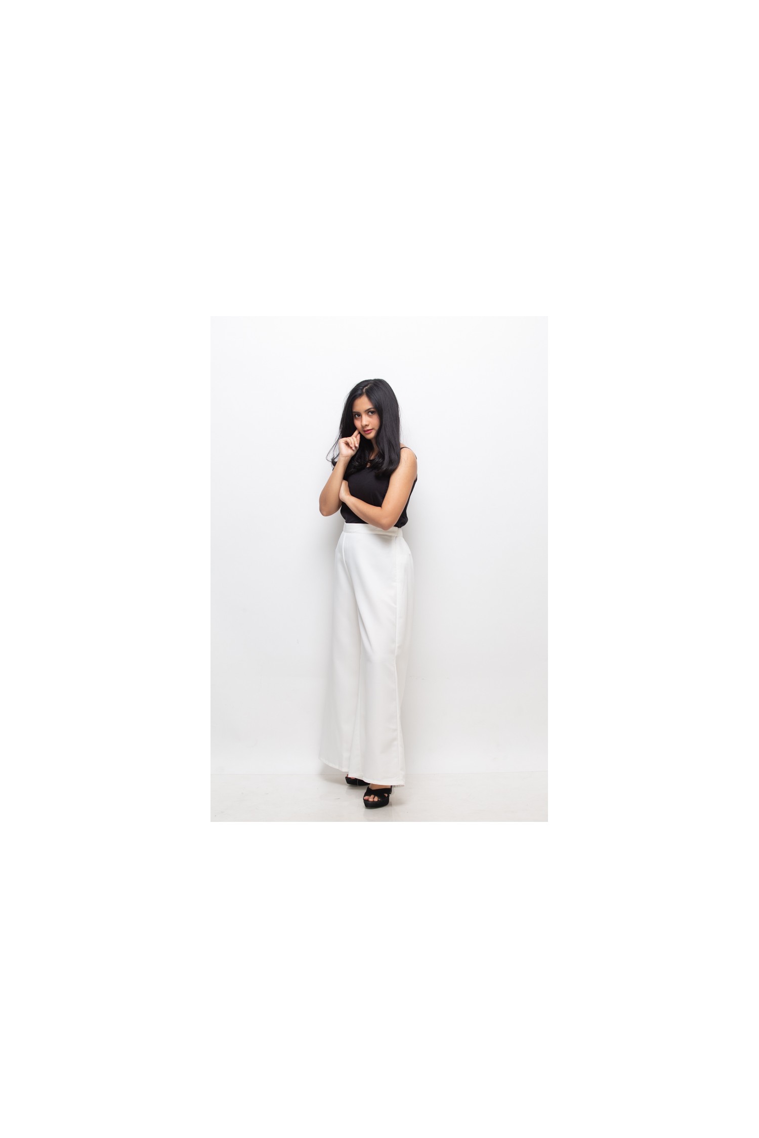 Almas Pants Warna Putih, bahan yang digunakan Poly Linen Look. Cocok dipakai ke kantor dan berpergian.